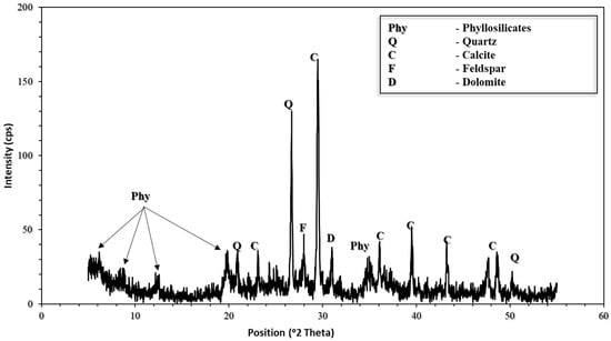 Marine deposited clays used in this study are Kyrenia Range, Çamlıbel Marl, which were identified as “Mirtou Marl” by Bellamy and Jukes-Brown []. Later in their study, Hakyemez et. al. [] identified this formation as Çamlıbel Marl. Palamakumbura [] noted that the initial emergence of the Kyrenia Range began during the Pliocene Epoch and resulted in a non-marine mountain range, surrounded by a shallow-marine environment. Additionally, the author added that the base of the sequence comprises a thick bedded carbonate deposit containing beds rich in either benthic and planktonic foraminifera or calcareous red algae. Furthermore, author stated that the calcium carbonate content of the formation originated from the limestones and dolomites of the Kyrenia zone and the chalks of the South Cyprus zone, and has a considerable part that is biogenic in origin. Characterization tests, such as Atterberg limits, sieve analysis, and specific gravity, were conducted according to ASTM D4318-17 [], ASTM D6913-17 [], and ASTM D854-14 [], respectively. The grain size distribution of clay is shown in Figure 1 (note that it is well-graded with a D50 particle diameter of 0.0035 mm). Table 1 shows the physical characteristics of the clay. In addition, this clay is categorized according to USCS (ASTM, 2017b []) as an inorganic clay with low to medium plasticity (CL). The specific gravity was determined in accordance with ASTM D854-14 []. X-ray diffraction analysis of bulk sample was completed with X’Pert Pro MPD diffractometer using monochromatic Cu–Ka radiation. The X-ray diffraction (XRD analysis of studied clay sample is shown in Figure 2. The EDX of marine deposited clay is shown in supplementary file (see Figure S2).