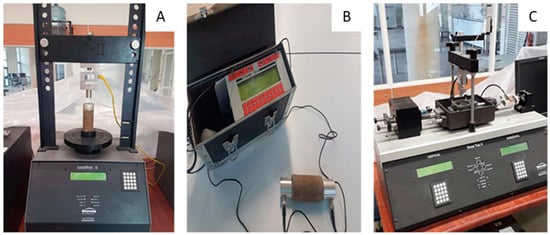 In this study, the ASTM C 597-02 [] was used to determine the ultrasonic pulse velocity. Samples tested during this stage were prepared, cured, inundated, and dried, as stated in the UCS test. The device used was MATEST Ultrasonic Tester Model C368 (Figure 3B). Two transducers were connected to the samples on both sides using grease. The distance between the transducers (the length of the specimen) was accurately determined. After that, the device sent a velocity wave, and subsequently, the time for the wave to travel through the sample was measured. The distorted form of the wave was viewed on the device’s screen.
