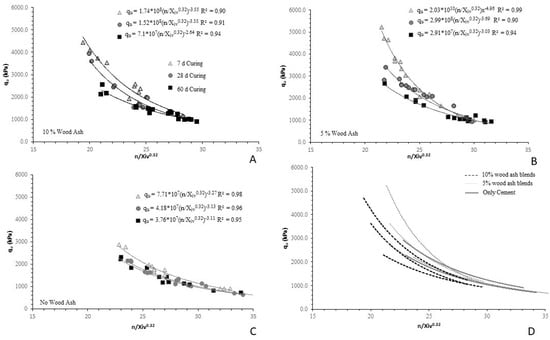 Figure 4 and the available literature indicate that a reduction in compressive strength is due to an increase in porosity and reduction of blend content. Furthermore, in Figure 4A,B, where 10% and 5% of wood-ash were used, respectively, the 7 and 28 days of curing did not affect the qu at high porosity. On the other hand, curing for 60 days yielded an improvement. The contribution in all curing periods was more pronounced at low porosity.
