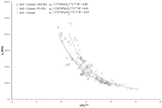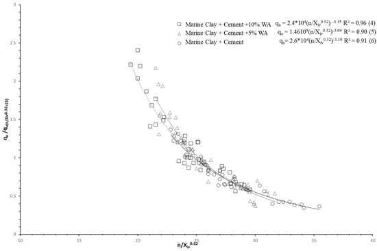 Normalization of unconfined compressive strength (qu) (for the whole range of η/Xiv0.32) with adjusted porosity/binder index for all blends considering cement only, cement + 5% wood-ash, and cement + 10% wood-ash.