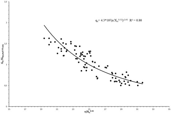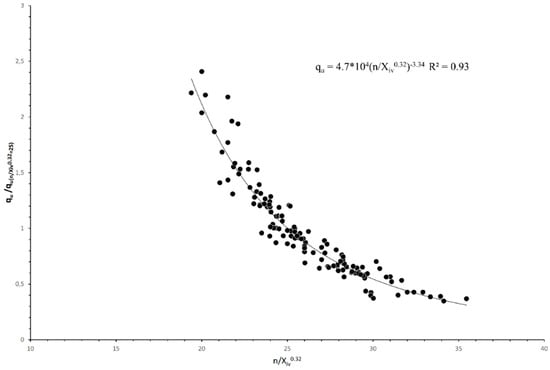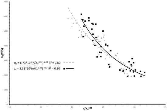 To validate the applicability of Equation (7), the results of other authors on different soil types and blends were used in accordance with Equation (7) to predict the qu. Figure 8 shows the unconfined compression test results obtained by Consoli et al. [] for cement-stabilized Portugal silty sand (Table 1) together with the line predicted using Equation (7). As suggested above and in the literature, η/Xiv0.32 = ∇ = 25 was chosen, and the corresponding qu was found to be 6300 KPa from the curve of Consoli et al. []. Substituting the value of qu with Xiv0.32 = 25 in Equation (7) and varying Xiv0.32, a curve was plotted together with the laboratory test data. Figure 8 demonstrates that the predicted curve represents the experimental data.