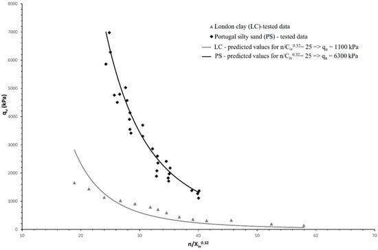 From the same paper by Consoli et al. [], compression test results were obtained for London clay stabilized with cement. The data were taken from the specimens with Xiv0.32 = ∇ = 25 and qu (for ∇ = 25) = 1100 KPa. By substituting these values into Equation (7) and varying Xiv0.32, a curve was plotted together with the laboratory test data. Figure 8 shows the curve obtained using Equation (7) that represents the experimental data, and the fit of the plotted curve shows a high degree of similarity with the curve plotted by experimental results.