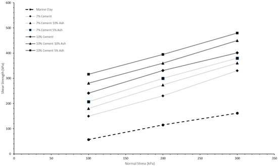 Typical shear strength and normal stress data with failure envelopes of marine clay, 5% wood-ash, and 10% wood-ash cement-replaced specimens with η/Xiv0.32 = 25 under effective normal stress of 100, 200, and 300 kPa with seven days as the curing period are shown in Figure 11. Table 4 shows that cohesion increased with the increase in cement content. Furthermore, the replacement of cement with 5% wood-ash resulted in a further increase in cohesion, where a further increase in wood-ash replacement to 10% resulted in reduced cohesion. An increase in cohesion at 5% wood-ash replacement indicates the introduction of bonding strength along with clay particles. Stabilizing the marine clay with cement alone resulted in an increased friction angle from 27 to 42, where a further increase of cement content to 10% resulted in a slight decrease in friction angle to 39–40. Wood-ash replacement did not seem to influence the friction angle of the specimens. Additionally, the brittleness index recommended by Bishop [] was utilized to explore the softening response of blends with wood-ash inclusion at varying cement contents. The brittleness index is defined as: