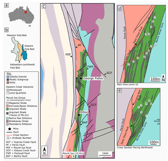 Location of the study area with reference to (a) Australia and (b) the Mount Isa Inlier. (c) A simplified geological map of the study area after Valenta [16] with the location of the Hilton and George Fisher Zn-Pb (Ag) deposits. (d) Plan view of the Hilton Zn-Pb (Ag) deposit showing the seven north to south trending stratabound ore zones. (e) A schematic cross-section of the Hilton Zn-Pb (Ag) deposit facing northwest. Figure 1d,e have been updated from Valenta [17] using available mine models.