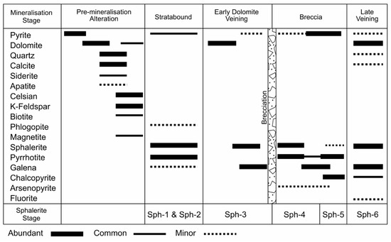 Paragenesis of the Hilton Zn-Pb (Ag) deposit based on the samples from this study. Pre-mineralisation alteration is followed by stratabound mineralisation containing sph-1 and sph-2. Early dolomite veins contain sph-3 and are followed by a stage of brecciation and the emplacement of sph-4. This is overprinted by Pb and Cu mineralisation where sph-4 is recrystallised to produce sph-5. Multiple varieties of late veins crosscut all types of mineralisation and contain sph-6.