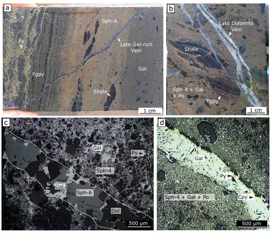 Sphalerite paragenesis at the Hilton Zn-Pb (Ag) deposit (continued). (a,b) Polymetallic sulphide-rich breccias cross-cut by late dolomite and sulphide-rich veins containing sph-6 and galena. (c,d) Reflected light photomicrographs of late sph-6 bearing veins cross-cutting sph-4 breccia-stage mineralisation. Abbreviations: sph = sphalerite, dol = dolomite, fgpy = fine-grained pyrite, py = pyrite, gal = galena, po = pyrrhotite, cpy = chalcopyrite.