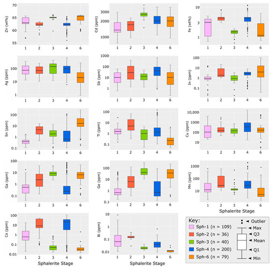 Sph-3 and sph-6 are consistently enriched in Zn, Ga, Ge, Sn and Cd, and depleted in Co, Tl, Bi and Fe relative to the primary sph-1 and sph-4. Additionally, sph-6 is also depleted in Ag, Sb and Mn relative to sph-4.