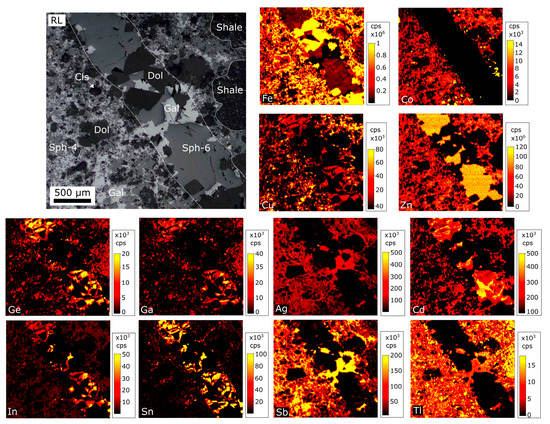 LA-ICP-MS trace element maps across a sample containing sph-4 and a ferroan-dolomite vein containing sph-6. The trace element maps indicate that sph-6 is enriched in Zn, Ge, Ga, Cd, In and Sn, and depleted in Fe, Co, Ag, Sb and Tl relative to sph-4. It is also seen that sph-6 is zoned in the elements Cu, Ge, Ga, Cd, In and Sn. All trace element maps are in counts per second (cps).