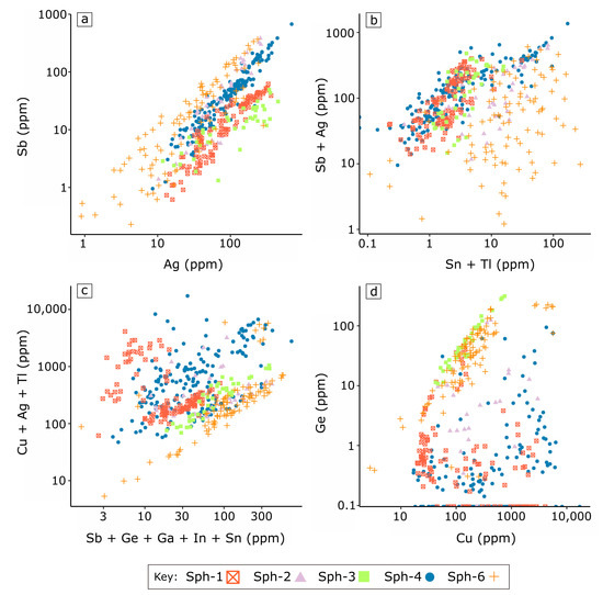 A simple direct substitution for the bivalent elements Mn, Co and Cd with Fe is explained through the substitution mechanism (Mn2+, Co2+, Cd2+ Fe2+; [7]). A positive correlation between Ag and Sb for all sphalerite varieties (Figure 10a; Supplementary Materials Table S3) is consistent with a dominant coupled substitution mechanism (2Zn2+ Ag+ + Sb3+) into sphalerite [13,39]. For sph-1 (R = 0.52), sph-2 (R = 0.89) and sph-4 (R = 0.77), Tl + Sn broadly correlate with the concentration of Ag + Sb (Figure 10b), indicating the presence of the substitution mechanisms 2Zn2+ (Ag+ or Tl+) + Sb3+ and 3Zn2+ 2(Ag+ or Tl+) + Sn4+. The substitution of trivalent and tetravalent elements Sb3+, In3+, Sn4+, Ge4+ and Ga3+ with varying amounts of monovalent elements Ag+, Cu+ and Tl+ has been widely documented (Figure 10c; [7,40]), and is interpreted to represent the dominant substitution mechanism for the incorporation of these elements into the analysed sphalerite. A strong correlation between Ge and Cu (Figure 10d; Supplementary Materials Table S3) in sph-3 (R = 0.99) and sph-6 (R = 0.70) indicate the dominant mechanism for their substitution into sphalerite is 3Zn2+ Ge4+ + 2Cu+ [13], while no such correlation is shown by sph-1 (R = −0.16), sph-2 (R = 0.10) or sph-4 (R = 0.06).