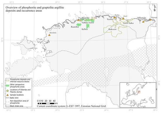 During the opencast mining of phosphorite in 1964–1991, some tens of millions of tons of graptolite argillite were mined from the covering layer of phosphorite ore at Maardu town, near Tallinn. As an overburden, graptolite argillite was mixed up with other overlying rocks, including carbonate rocks (limestone), sandstone, glauconite sandstone and Quaternary sediments. The material was concentrated into large waste dumps. For example, in 1989, opencast mining at Maardu was carried out on more than 6 km2 [45]. The mining and processing stopped in 1991. At present, the waste dumps at Maardu contain about 73 million tons of graptolite argillite [45,46].
