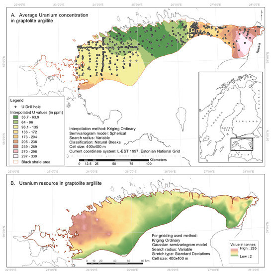 (A) Location map of the drill holes penetrating the graptolite argillite layers and the extent of the graptolite argillite. U tonnage model in the 400 to 400 m cell at the modeled thickness of the graptolite argillite. (B) Modeled uranium content in the Estonian GA based on calculated average drill core contents (data: Geological Survey of Estonia; www.maaamet.ee [3]).