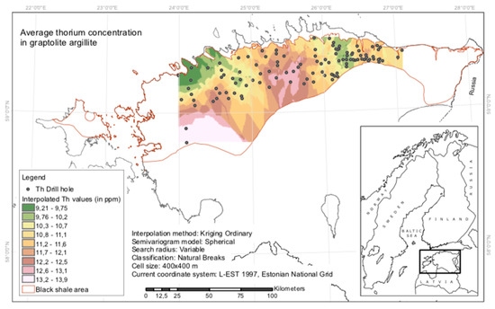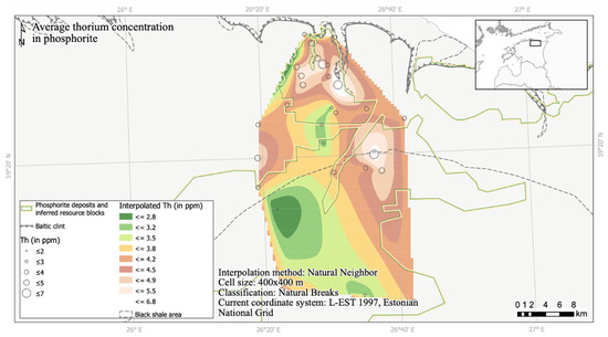 Presently, the calculation for thorium and vanadium, based on the cell of 400 m × 400 m, was conducted (for Th, see Figure 4). Vanadium concentrations (as drill core averages; 469 drill cores) commonly vary in between 190 and 1700 ppm, being in certain layers as high as 4500 ppm [5]. The calculated vanadium tonnage is 47.7538 million tons.