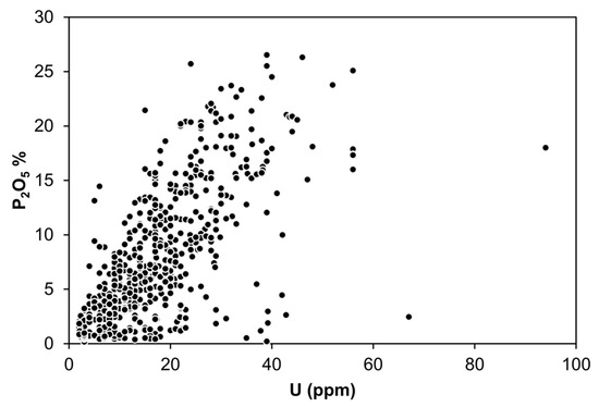 In the vertical sections, there are no universally definitive trends in the distribution of U (Figure 6), although certain co-variability with P2O5 is noted, as is also implied from the biplot of U and P2O5 of the historical dataset (Figure 7). In the Toolse deposit, the richest phosphorite beds are the lowest and higher enrichment of U can occur there. In the Rakvere deposit, there appears to be a two-layered phosphorite accumulation, which is not currently defined in the resource models and is treated as a single layer. Generally, the highest P2O5 concentrations are noted in the upper part of the ore layer [40]. The same trend is at least partly observed in the distribution of U concentrations. The content of U in phosphorite is about an order of magnitude lower than in the overlying black shale.