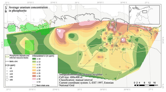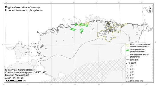 There appears to be a trend that the northernmost phosphorite deposits area is the most enriched in U (~25–50 ppm; Figure 9). There are only a few locations where U concentration exceeds 25 ppm, which are in the middle and southern parts of the phosphorite occurrence area (Rakvere deposit). The mean concentrations of U are 24 ± 6 ppm and 15 ± 4 ppm in the Toolse and Rakvere deposits, respectively. The overall weighted average across all Estonian phosphorite samples is 16 ± 11 ppm, implying a high variability, but generally a low amount of U. The formerly shown errors are given as one standard deviation. Perspective resource estimates associated with phosphorite are given in Table 4, and an extended overview in Appendix A.