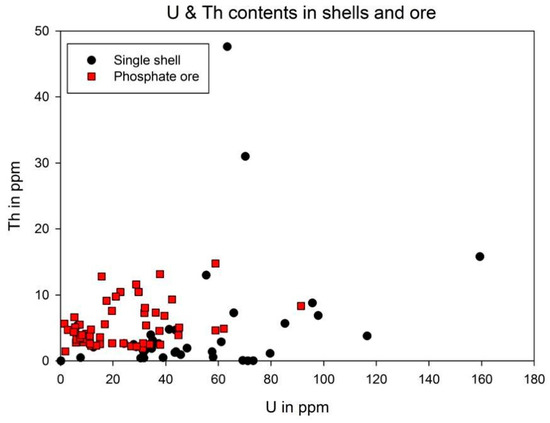 Recent studies have shown relatively enriched but variable concentrations of REEs in single phosphate shells. For instance, La in a single shell ranges from 50 to 550 ppm, Ce—40–1200 ppm, Pr—4–170 ppm, Nd—20–800 ppm, Sm—3–180 ppm and Gd—4–135 ppm [44]. The total REEs can reach 3000 ppm; however, on average they range between 1000 and 2000 ppm. At the moment the Estonian phosphorites cannot be regarded as an economic REE source, but considering REEs as a co-product of phosphorus production, it may economically be feasible. Considering the possibility that these resources will be developed for phosphorus (and REE) production, it is important to focus also on uranium and thorium; however, the contents of U and Th are quite low to provide economical interest but high enough in environmental meaning. The new analyses show that uranium content in the ore ranges between 2 and 91 ppm (52 samples), whereas in single shells it ranges between 0.5 to 159 ppm (41 samples; Figure 11). Thorium content in ore ranges between 1 to 15 ppm and in shells 0.5–48 ppm. It needs to be emphasized that in both single shells and ore, uranium and thorium contents are spatially very heterogeneous.