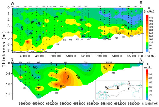 Thorium seems to possess a similar trend—being more concentrated in the northernmost part of the phosphorite deposits area (Figure 10). Yet, this indication is very speculative because there are too few data points situated in the Rakvere deposit area. It can be mentioned here that the northernmost part of the Toolse deposit also yields comparatively higher total rare earth element (REE) concentrations.