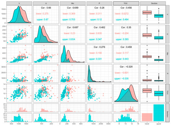 Recent ICP-MS geochemical data from 11 north-western Estonian drill cores were divided into upper and lower beds, which revealed a reverse trend with regard to U association with P2O5 and total organic carbon (TOC) [38]. Namely, the correlation of U and TOC is weakly positive in the upper bed and reverses to weakly negative in the lower bed (see Section 4, Discussion). The opposite was observed in the relation between P2O5 and U—their association becomes more relevant in the lower, U-enriched bed. Hierarchical clustering of dataset classifies U within the group of typical redox-sensitive elements such as Mo, Sb, V, Re as well as TOC, Ag, Pb and Te.