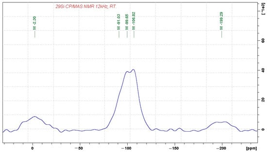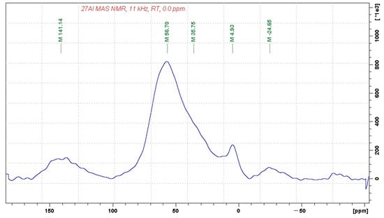 In order to identify the coordination of aluminum and silicon ions, the chemical and mineralogical analyses were complemented by 27Al and 29Si MAS-NMR (magic-angle spinning–nuclear magnetic resonance) analyses in the solid state, presented in Figure 1 and Figure 2, respectively.