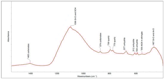 The FTIR spectrum of FFA (after two months) in the spectral region of 1500–500 cm−1 (Figure 3) has proven the presence of such phases as carbonates (the bands at 1405 and 874 cm−1), quartz (the bands at 799 and 778 cm−1) and anhydrite (the bands at 677, 612 and 593 cm−1). The strongest absorption band, centered at 1098 cm−1, contains a series of overlapping bands belonging to sulfates (anhydrite and ettringite) and the Si-O and Si-O-Si bonds of quartz, which are accompanied by less intense bands between 600 and 400 cm−1, respectively.