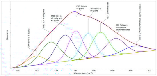 The deconvolution procedure of the spectral region of 1250–900 cm−1 (Figure 4) makes it possible to resolve these individual components. The bands at 1095, 1070 and 1031 cm−1 are related to the asymmetric stretching of Si-O-Si bonds. The weak band at 1200 cm−1 can be described as a spectral shoulder of the principal band at 1070 cm−1. Further bands (at 1160 and 1125 cm−1) are related to the asymmetric stretching of the sulfate ion (ν3 SO4). The band at 1125 cm−1 is indicative of the relative isolation of this ion in the hexagonal prism structure of ettringite []. Other bands, apparent at 990 and 936 cm−1, can be ascribed to the Si-O-Al bonds of amorphous non-specified aluminosilicates.