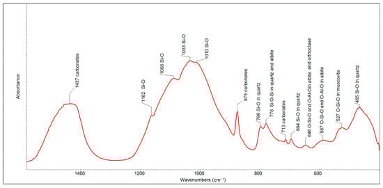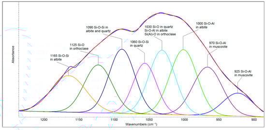 The deconvolution of the spectral region of 1250–900 cm−1 (Figure 6) revealed seven bands belonging to quartz, albite, orthoclase and muscovite that can be divided into two parts. The first of these (1200–1050 cm−1) is related to Si-O and Si-O-Si bonds, and the second (1050–900 cm−1) arises mainly from the second type of bridging (i.e., Si–O–Al stretching) []. The bands at 1165 and 1090 cm−1 in albite and 1090 and 1060 cm−1 in quartz belong to the Si-O-Si stretching vibrations, whereas 1125 cm−1 can be attributed to Si-O stretching vibrations in orthoclase []. The band at 1030 cm−1 belongs to Si-O bonds in quartz as well as to Si-O-Al in albite [] and the Si(Al)-O stretching vibration in orthoclase []. Albite (NaAlSi3O8) and orthoclase (KAlSi3O8) are the extreme members of the plagioclase minerals, forming sodium and potassium feldspars, respectively. The bands attributed to Si-O-Al stretching vibrations in muscovite are evident at lower wavenumbers (970 and 925 cm−1). The region of 800–700 cm−1 originates from tetrahedral–tetrahedral ion vibrations and from a combination of Si(Al)–Al–O and Si–O–Si vibrational modes, and it is complex with contributions from high-frequency silica framework (Si2O) vibrations [,]. Therefore, the band around 778 cm−1 has a higher intensity than the same band in the FFA spectrum. The bands in the region of 700–500 cm−1 are attributed to O–Si–O and O–Al–O bending vibrations [].