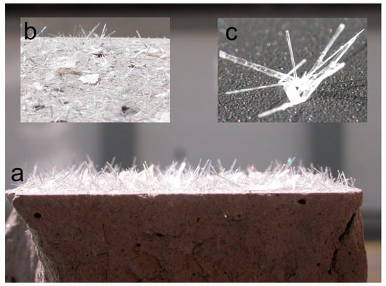 For the clarification of the disappearance of gypsum and aragonite in two-year-old samples, laboratory samples of solidified FFA were prepared (described in the Section 2.2 Sample Preparation above). These samples were placed in a plastic box and covered by a lid. The main attention was focused on the stability of the submerged sample. After several months, needle-like crystals began to appear on the surface of the body and flake shapes formed on the surface of the water. Figure 7 shows the state of the observed sample after its removal from the water.
