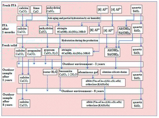 Based on the results, the hypothesis presented and the evidence supporting it, a scheme describing phase transformations in fly-ash-based solids has been proposed (Figure 8).