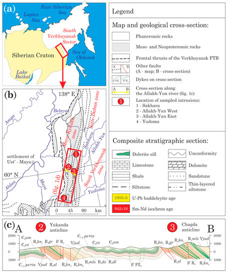 The sedimentary succession deposited along the south-eastern margin of the Siberian Craton (Figure 1) includes carbonate and clastic rocks ranging in age from Mesoproterozoic to Mesozoic, and records the long-term evolution from an intracratonic basin to a passive margin, and finally to a fold-and-thrust belt [1,2,3,4]. Several mafic magmatic events accompanied the pre-Mesozoic evolution of the eastern Siberian Craton margin, including Mesoproterozoic, latest Mesoproterozoic to early Neoproterozoic, early Paleozoic, and Devonian events [5,6,7]. Paleozoic mafic magmatic events have been described and discussed in many papers, and are mainly reported from the eastern margin of the Siberian Craton [2,5,6,8,9]. The latest Mesoproterozoic to early Neoproterozoic mafic magmatic event, commonly known as the Sette-Daban event [8], was dated by U-Pb baddeleyite and Sm-Nd isochron methods [6,10,11], but very limited information has been published on the geochemical and isotopic compositions of the associated igneous rocks [6,9]. The main goal of this study is to present new data on the geochemical and isotopic compositions of the latest Mesoproterozoic to early Neoproterozoic mafic intrusions and shed new light on their tectonic setting.