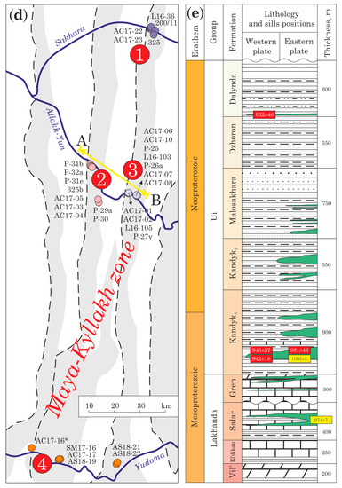 (a,b,d) Location maps, (c) cross-section (after [12], modified), and (e) composite stratigraphic section (after [12,13,14] and observations by authors) of the Meso- and Neoproterozoic succession in the Maya-Kyllakh zone. Sample locations, numbers, and specific colors used in the following diagrams are shown in Figure 1d. U-Pb baddeleyite and Sm-Nd isochron ages in Figure 1e are from [7,10,11].