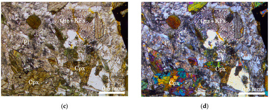 Photographs of thin sections in transmitted light (left column without analyzer, right column with analyzer), (a) and (b) sample AC17-07 (magnification ×10) with gabbroophitic texture, (c) and (d) sample AC17-23 (magnification ×5) with micrographic texture. Pl—plagioclase, Cpx—clinopyroxene, Hbl—hornblende, Ilm—ilmenite, Qtz—quartz, KFs—potassium feldspar.