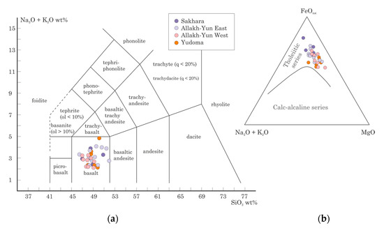 The intrusive igneous rocks associated with the Sette-Daban magmatic event display small variations in SiO2 (46.76–51.99 wt%) and K2O + Na2O (2.1–4.8 wt%), but larger variations in MgO (1.85–9.16 wt%), plotting in the moderately alkaline basalt field on the total alkali-silica (TAS) diagram (Figure 4a). All dolerites plot in the tholeiitic basalt field on the alkali-FeOtot-MgO diagram (Figure 4b), lining up along the FeO-MgO axis. The Sakhara dolerites are characterized by the strongest Fe tholeiite signature, while the Yudoma dolerites are more calc-alkaline. The Mg# increases from the Sakhara (0.13–0.38) to the Yudoma (0.41–0.51) samples, indicating the latter to be closer to the composition of primitive mantle melts. Dolerites from both the western and eastern Allakh-Yun river do not plot as two distinct groups, with their compositions overlapping those of the Sakhara and Yudoma samples.