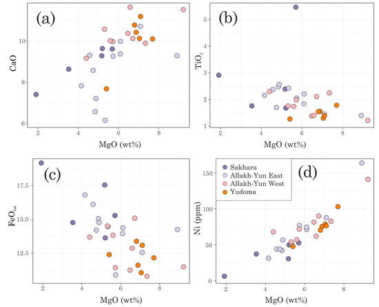 Plots of (a) CaO (wt%), (b) TiO2 (wt%), (c) FeOtot (wt%), and (d) Ni (ppm) vs. MgO (wt%) for the Sette-Daban event dolerites.