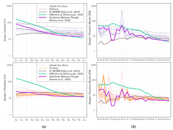 (a) Chondrite-normalized rare earth elements (REE) plot and (b) primitive mantle-normalized trace element diagram for the Sette-Daban magmatic event intrusions. The trace element compositions of ocean island basalts (OIB), along with chondrite and primitive mantle normalization values, are from [26]. The trace element compositions of normal mid-ocean ridge basalt (N-MORB) are from [27]. Trace element compositions of the southern Mariana Trough are from [24].