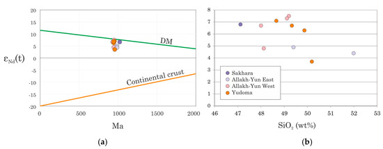 (a) εNd(t)—age (Ma) plot. (b) εNd(t)—SiO2 (wt%) plot.