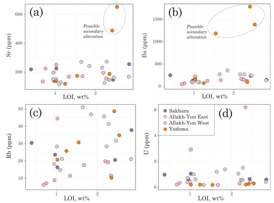 Plots of (a) Sr (ppm), (b) Ba (ppm), (c) Rb (ppm), and (d) U (ppm) vs. loss on ignition (LOI) (wt%) for the Sette-Daban event dolerites.