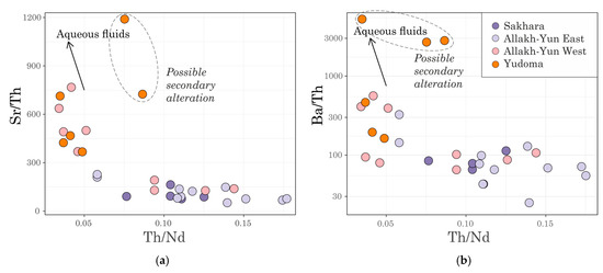 The enrichment in, and wide variation of, HFM elements in the observed dolerites could be explained as a result of the fertilization of lithospheric mantle by aqueous fluids at shallow depths prior to melting [24,30]. The ratios of mobile-to-immobile incompatible trace elements which have similar bulk partitioning coefficients (e.g., Ba/Th, Sr/Th) do not considerably fractionate during mantle melting and following fractional crystallization [31]. Therefore, any variation in their ratios can be interpreted to reflect geochemical heterogeneity of the mantle. On the other hand, LILE are soluble in aqueous fluids and any variations in Ba/Th and Sr/Th ratios are likely to reflect the secondary impact of aqueous fluids (metasomatism) on the composition of the mantle source [32,33]. On the plots of Ba/Th and Sr/Th versus Th/Nd (Figure 9), the analyzed dolerites form similar negatively correlated trends, indicating the importance of aqueous fluids for the generation of basaltic magma. The Yudoma and some of the western Allakh-Yun dolerites are characterized by higher Ba/Th and Sr/Th compared to those from the Sakhara and eastern Allakh-Yun, suggesting that they may be associated with larger contributions from aqueous fluids in the melting source. We suggest that the variations in contributions from aqueous fluids are associated with different depth levels of subduction-related alteration of the lithospheric mantle, including shallow depths for the source of the Yudoma dolerites, and deeper levels for the source of the Allakh-Yun and Sakhara dolerites [24].