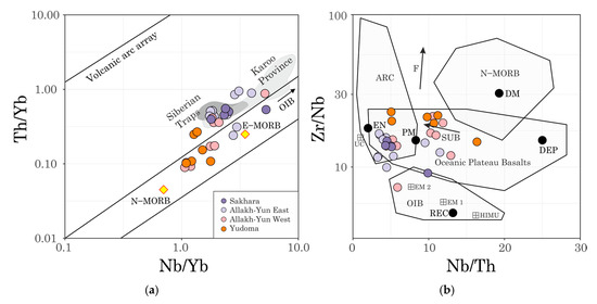 (a) Th/Yb–Nb/Yb plot [34,35]. The composition of the Siberian Traps (dark gray field) is taken from [36], while the composition of the Karoo Province is taken from [37]. (b) Zr/Nb–Nb/Th plot [38]. Abbreviations: UC—upper continental crust; PM—primitive mantle; DM—shallow depleted mantle; HIMU—high mu (U/Pb) source; EM 1 and EM 2—enriched mantle sources; ARC—arc-related basalts; N-MORB—normal mid ocean ridge basalt; OIB—oceanic island basalt; DEP—deep depleted mantle; EN—enriched component; REC—recycled component. Arrows indicate effects of batch melting (F) and subduction (SUB). References: [39,40].