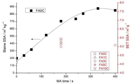 Blaine-specific surface area (SSA) of the fly ash (black symbols) and Brunauer–Emmett–Teller (BET) SSA of the FA + CaCO3 blends milled for 180 s (red open symbols) vs. mechanical activation (MA) time.