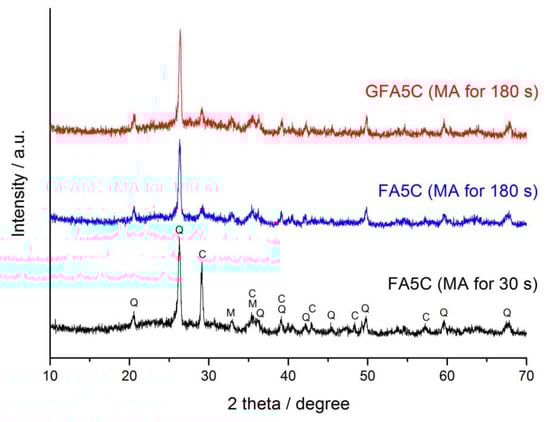 As a representative example of the geopolymers prepared using the blends containing 5% CaCO3 or less, Figure 3 shows the XRD pattern of the GFA5C specimen (MA for 180 s, curing for 28 d). No new peaks of crystalline phases are seen in the diffractogram and the peak intensities seem to be unchanged in comparison to those in the XRD pattern of the FA5C blend. Therefore, the product of geopolymerization (N-A-S-H gel) is X-ray amorphous. Its formation is confirmed by the appearance of a halo in the 2θ = 25–35° region. This agrees with previous works in which near ambient temperature curing conditions were employed to prepare geopolymers based on fly ash [45,80].