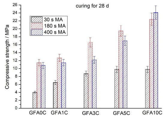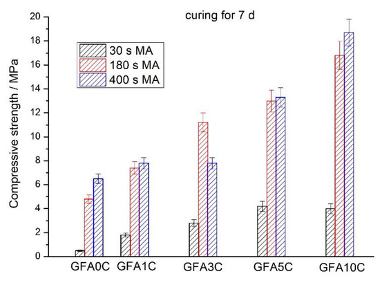 Obviously, blending the FA with calcite results in an increase of strength with an increase in the proportion of CaCO3 (Figure 4 and Figure 5). The positive effect of calcite addition to the FA is more pronounced for the 7-d aged geopolymers. The GFA10C geopolymer after curing for 7 d shows a strength 8.0-, 3.5- and 2.9-fold higher than the GFA0C geopolymer for 30, 180 and 400 s milling time, respectively (Figure 4). In agreement with the SSA data (Figure 2), milling for 180 s in comparison to milling for 30 s results in a significant increase in strength. However, the effect of further milling from 180 to 400 s is either a very small positive or even deleterious (Figure 4 and Figure 5). Although, as can be expected, the finer fly ash should display a better solubility in sodium hydroxide solution to produce a higher amount of geopolymer gel and, therefore, a higher strength. A similar effect of “overgrinding” on the compressive strength was observed for geopolymers based on fly ash milled using a ball mill, a vibratory mill, and a stirred media mill [44]. This was explained by the optimal particle size distribution which is another important factor affecting the mechanical properties of geopolymers. For workability reasons, the w/s ratio for geopolymers based on blends milled for 400 s was higher than that for mixtures milled for 180 s (Table 2). This can also lead to a decrease in the strength of the geopolymers based on the blends milled for 400 s. It is important to note that a further increase in both the MA time (>400 s) and the calcite content in the blends (>10%) led to a noticeable decrease in the workability of the pastes, the reasons for which are beyond the scope of this study. Thus, based on strength data and workability, the optimal MA time was 180 s.