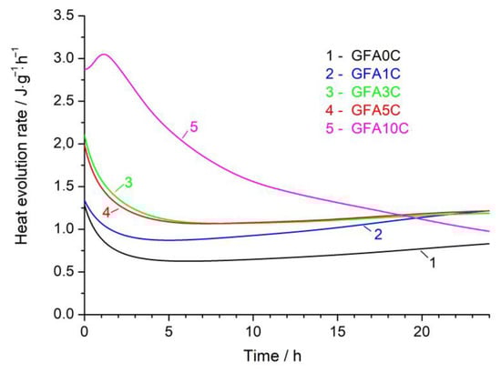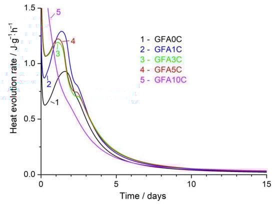 Full time scale heat flow curves (Figure 7) show that the second calorimetry peak for the pastes prepared using the blends containing 0–5% calcite (GFA0C-GFA5C) is located at the 1.0–1.6 d range, which is notably later than that for the GFA10C paste (Figure 6). One of the reasons for this may be the highest ratio of NaOH solution/FA in the GFA10C paste compared to the other pastes. The influence of calcite and secondary Ca-containing phases identified in the GFA10C geopolymer is discussed below.