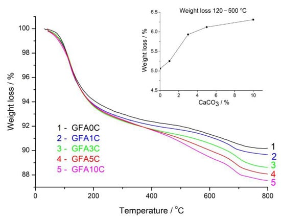 Thermogravimetric (TG) curves of the geopolymers based on the 100% FA (GFA0C) and the FA + calcite blends (GFA1C-GFA10C) mechanically activated for 180 s and cured for 28 d. In the insert, the weight loss of the geopolymers in 120–500 °C temperature range vs. calcium carbonate content in the blends is shown.