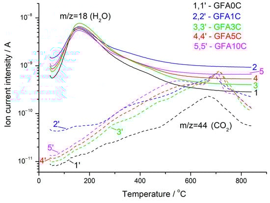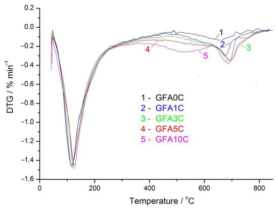 Coherent with the MS data of the collected gas (Figure 10), the DTG curves for GFA0C-GFA5C geopolymers show one main peak in the 450–800 °C region, related to decarbonization (Figure 9). For the geopolymer based on 100% FA (FA0C), this peak, centered at about 660 °C, is relatively weak and can be attributed to decomposition of sodium carbonates formed due to the interaction of the alkaline agent with atmospheric CO2 [79]. For the geopolymers prepared using the blends, the main decarbonization peak is related to the decomposition of calcite [62]. It is remarkable that, as in the case of the heat flow curves (Figure 6 and Figure 7), the DTG curve for the GFA10C differs from the curves of the other geopolymers. The main difference is that the GFA10C specimen shows another DTG decarbonization peak centered at 540 °C (Figure 9). In addition, the intensity of the peak of calcite decomposition for GFA10C, at about 690 °C, is comparable to the intensities of the peaks for GFA3C and GFA2C, although the content of calcium carbonate in the former is several times higher than in the latter. This indicates the partial transformation of calcite into another, less stable carbonate phase. The DTG peak width of this phase at 540 °C may indicate its low crystallinity.