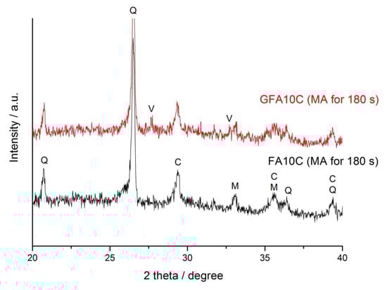 The X-ray diffraction patterns of the blend containing 10% CaCO3 (FA10C) milled for 180 s and of the geopolymer prepared using this blend after 28 d of curing (GFA10C). Phases marked are: Q—quartz, M—mullite, C—calcite, V—vaterite.