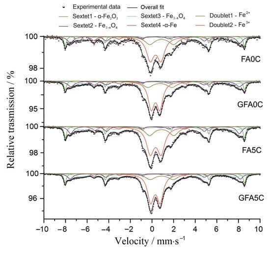 The registered Mössbauer spectra were evaluated with a model of four sextets and two doublets. The overall fit is also shown in Figure 13. The parameters of the sextet components indicate the presence of hematite (Sx1), magnetite (Sx2 and Sx3), and metallic iron α-Fe (Sx4). The presence of a small amount of elemental iron in the samples can be explained by the abrasion of the milling bodies during MA. According to the calculated parameters, the registered two doublet components, Db1 and Db2, correspond to octahedrally coordinated iron ions in the third (Fe3+) and second (Fe2+) degree of oxidation, which can be related to their presence in mullite and/or glass phases [91,92]. Comparison of the parameters of the geopolymers (GFA0C and GFA5C) and the precursors (FA0C and FA5C) shows insignificant differences in the environment and the distribution of iron ions in the corresponding phases (Table 3), indicating the relative inertness of iron in geopolymerization. This agrees with the observations of Lloyd et al. [93]. Transformation of the FA to geopolymer as a result of its activation with NaOH solution in the presence of CaCO3 is related to a small increase of the Fe3+ component. The small decrease of the isomer shift and quadrupole splitting of the ferric iron for the GFA5C specimen, in comparison to that for the FA5C blend, may indicate the partial reorganization of Fe3+ ions after alkali activation by incorporation into the aluminosilicate geopolymer matrix [94]. Iron oxides with a hyperfine magnetic structure (sextet components) do not undergo significant changes after the formation of the geopolymer.
