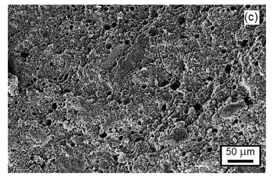 Figure 15 shows the magnified SEM image of the GFA10C specimen cured for 28 days. The particles of unreacted raw material covered with the gel, and closed spherical pores, are clearly seen within the paste microstructure. The spherical pores are likely formed as a result of the entrapment of air during the paste preparation. Within the geopolymer gel (the upper right corner in the Figure 15), particles of a newly formed phase can be seen. This phase was identified by EDS analysis as Ca(OH)2. The formation of small amounts of calcium hydroxide, which could not be detected in the sample by X-ray diffraction and FTIR spectroscopy, most probably occurs through the dissolution of calcite in the NaOH solution followed by precipitation of Ca(OH)2 [95]. This result is in line with observations of Provis et al. [96]. Using high-resolution synchrotron X-ray fluorescence, they revealed that discrete calcium hydroxide regions, a few tens of nanometers in size (not detectable by XRD), were scattered throughout the geopolymer binder synthesized by hydroxide (KOH) activation of low-calcium fly ash. Therefore, Ca(OH)2 can also be formed in small amounts in the geopolymers with a lower content of calcite (GFA0C-GFA5C). It should also be noted that calcium hydroxide precipitates of size about 10 μm, which were also not identified by X-ray diffraction, were observed by SEM-EDS in the microstructure of geopolymers prepared by activation of the 80% metakaolin + 20% calcite blend with sodium silicate solution [60].