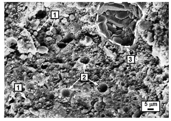 Magnified SEM image of the GFA10C geopolymer cured for 28 days (MA of the FA10C blend was carried out for 180 s): (1)—particles of the partially reacted FA covered with the gel; (2)—closed spherical pores; (3)—Ca(OH)2.