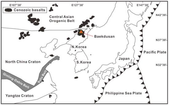 - Choi, H.-O.; Choi, S.H.; Lee, Y.S.; Ryu, J.-S.; Lee, D.-C.; Lee, S.-G.; Sohn, Y.K.; Liu, J.-Q. Petrogenesis and mantle source characteristics of the late Cenozoic Baekdusan (Changbaishan) basalts, North China Craton. Gondwana Res. 2020, 78, 156–171. [Google Scholar] [CrossRef]