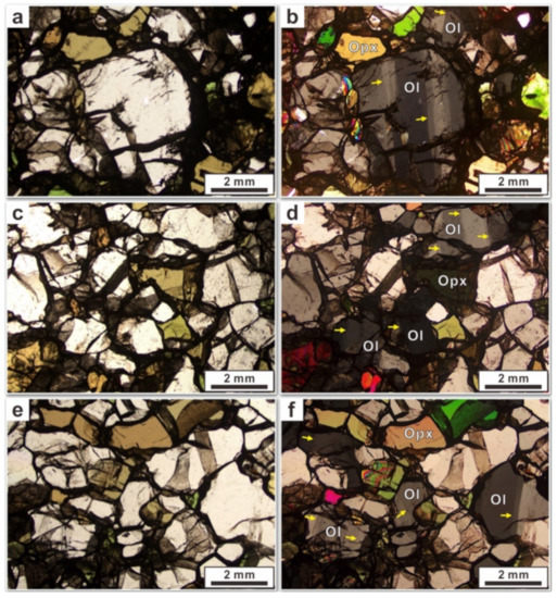 Optical photomicrographs of small-scale thin sections in plane-polarized light (a,c,e) and cross-polarized light (b,d,f) illustrating the typical microstructures from the Baekdusan peridotite xenoliths. (a,b) Coarse-granular peridotite (BD-19). (c,d) Fine-granular peridotite (BD-17). (e,f) Fine-granular peridotite (BD-21). Ol (olivine), Opx (orthopyroxene). Yellow arrows denote subgrain boundaries and/or undulose extinction in olivine.