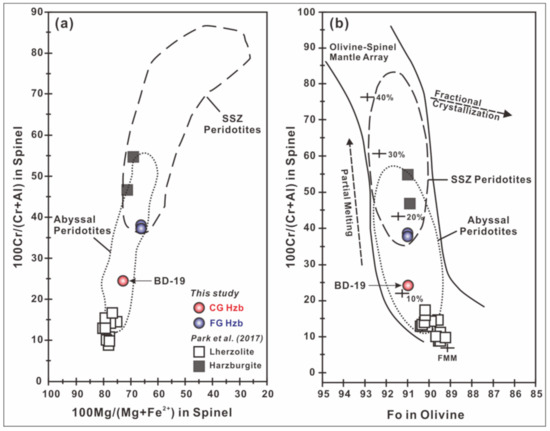 Plots of (a) spinel Cr# versus Mg# relationship and (b) olivine Fo# versus spinel Cr# relationship. The olivine–spinel mantle array and melting trend (annotated by melting %) given in (b) are from Arai [48]. Data sources: abyssal peridotites [49] and suprasubduction zone (SSZ) peridotites [50,51,52]. FMM = fertile MORB mantle. Previous data from the Baekdusan peridotite xenoliths [21] are also shown as squares for comparison. Coarse-granular (CG; red circles) and fine-granular (FG; blue circles) harzburgite (Hzb) from the Baekdusan peridotites.